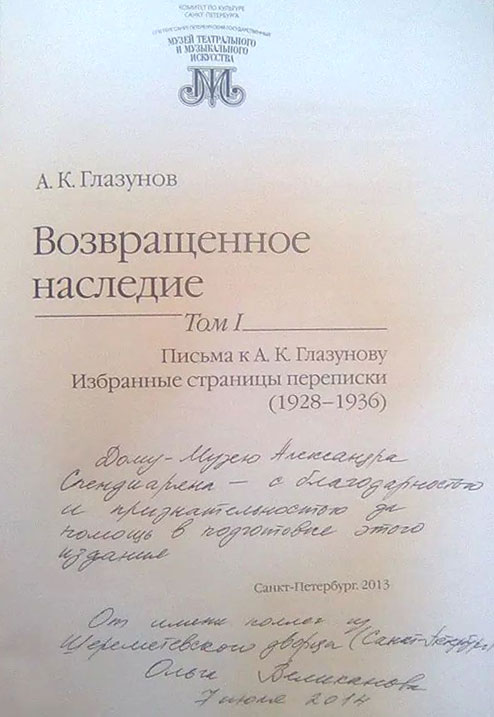 Այս գրքի լույս ընծայմանն աջակցել է նաև Ալ. Սպենդիարյանի տուն-թանգարանը՝ տրամադրելով արխիվային նյութեր: Գրքի խմբագիրներից մեկի՝ Շերեմետևյան պալատ Երաժշտական թանգարանի տնօրեն Օլգա Վելիկանովայի շնորհիվ երաժշտագետների և Գլազունովի արվեստի սիրահարների համար այս անչափ կարևոր գիրքը արդեն մեր թանգարանում է: