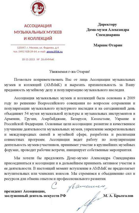 A member of the Association of Musical Museums and Collections In 2016 Alexander Spendiaryan House-museum has become a member of the Association of Musical Museums and Collections.