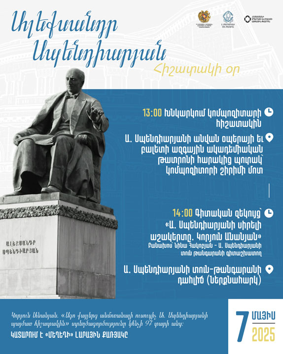 The program began in the park adjacent to the National Academic Theatre of Opera and Ballet, at Spendiaryan’s grave. Representatives from the Ministry of Education, Science, Culture and Sports; the A. Spendiaryan House-Museum; the Opera and Ballet National Academic Theatre named after the composer; the Union of Composers of Armenia; the Komitas State Conservatory of Yerevan; the Armenian Choral Society; and the Arno Babajanyan Musical-Pedagogical College, along with admirers of Spendiaryan’s art, laid flowers and offered incense in tribute to the composer.